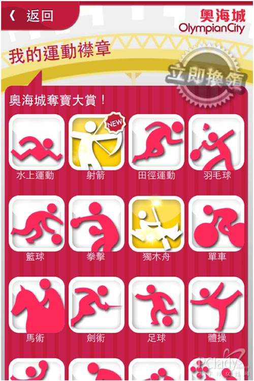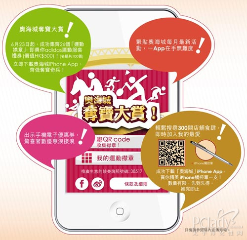 为迎接2012年于英国伦敦举行的体坛盛事,奥海城特别推出《奥海城夺宝大赏》!6月23日至8月23日期间,每日开启应用程序,即可随机解锁「运动襟章」(每日可解锁2个)。另到奥海城商场以QR Code扫瞄可取得「奥运襟章特别版」(共6个),用户成功集齐26个「运动襟章」,即可获得$500 adidas现金劵!