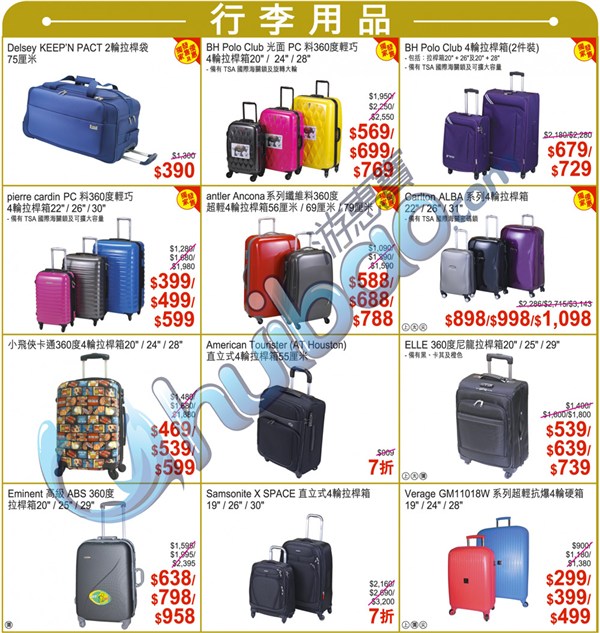 包括:delsey keep'e pact、BH Polo Club、pierre cardin、antler Ancona、小飞侠、ELLE、Samaonite等。